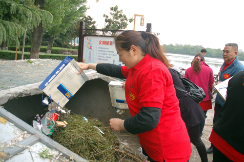 在白河湿地公园,志愿服务队伍两人一组沿河从北到南一路认真清理地面白色垃圾,并将清理的垃圾集中倒入路边垃圾桶内。